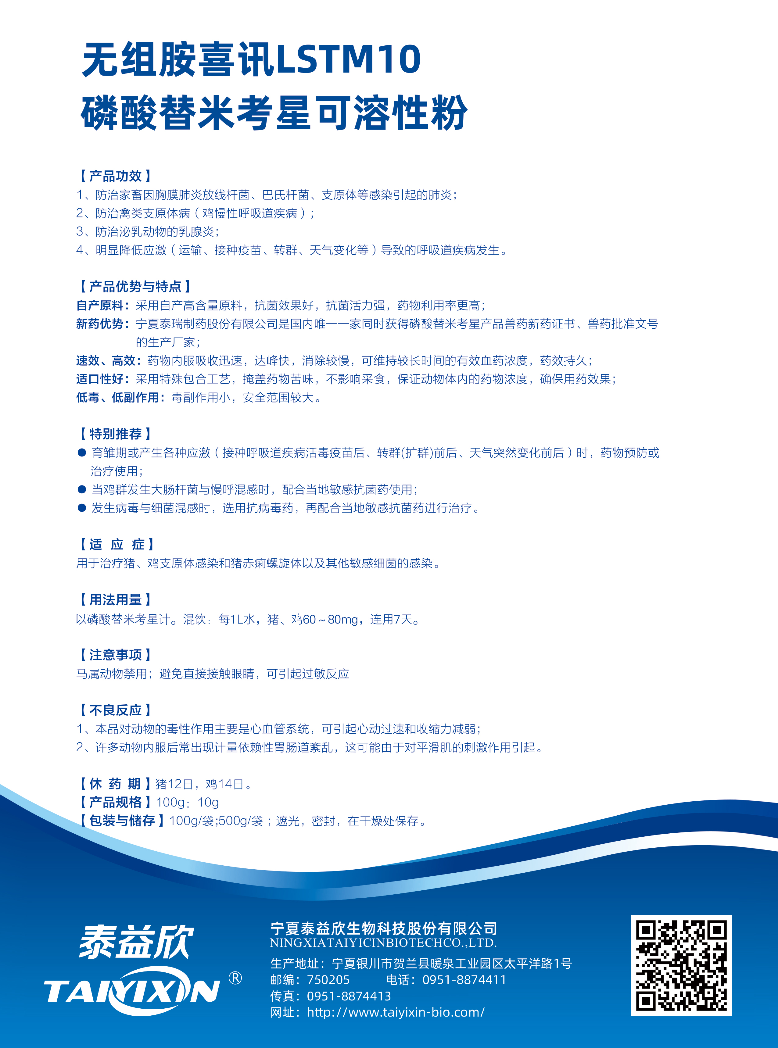 新藥優(yōu)勢:寧夏泰益欣生物科技股份有限公司是國內(nèi)唯--家同時(shí)獲得磷酸替米考星產(chǎn)品獸藥新藥證書、獸藥批準(zhǔn)文號(hào)的生產(chǎn)廠家