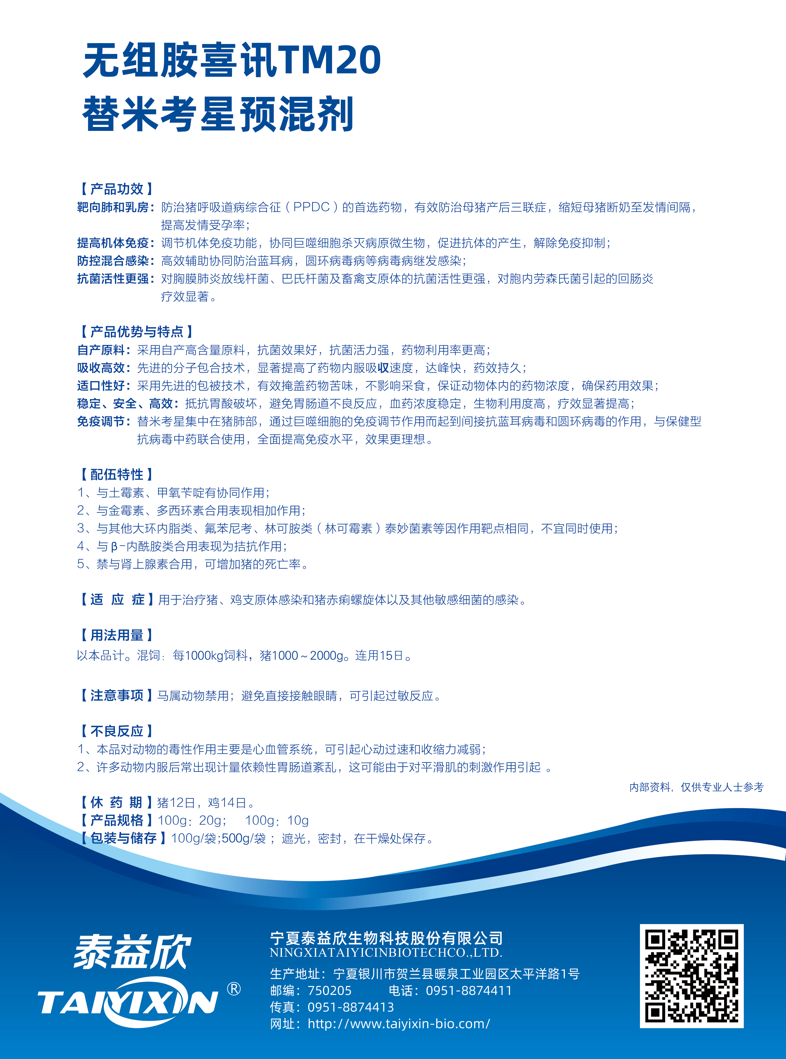 替米考星,主要用于防治家畜肺炎(由胸膜肺炎放線桿菌、巴氏桿菌、支原體等感染引起)、禽支原體病及泌乳動物的乳腺炎;